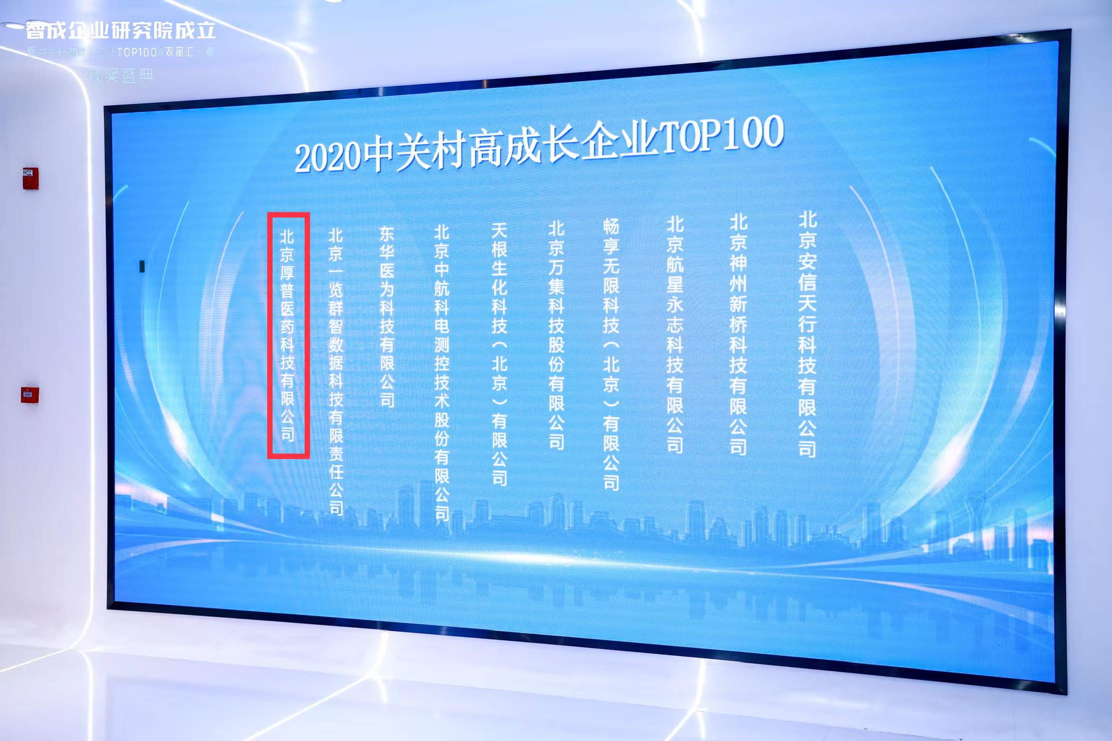 12月21日,“智成企业研究院成立——暨2020年中关村高成长企业TOP100&双星汇大赛颁奖盛典”在奥北科技园——国泰大厦隆重举行。厚普医药凭借在大健康领域的技术优势和助力创新药研发的卓越表现成功入选“中关村高成长企业TOP100”和“大健康领域潜力10强”双奖项。